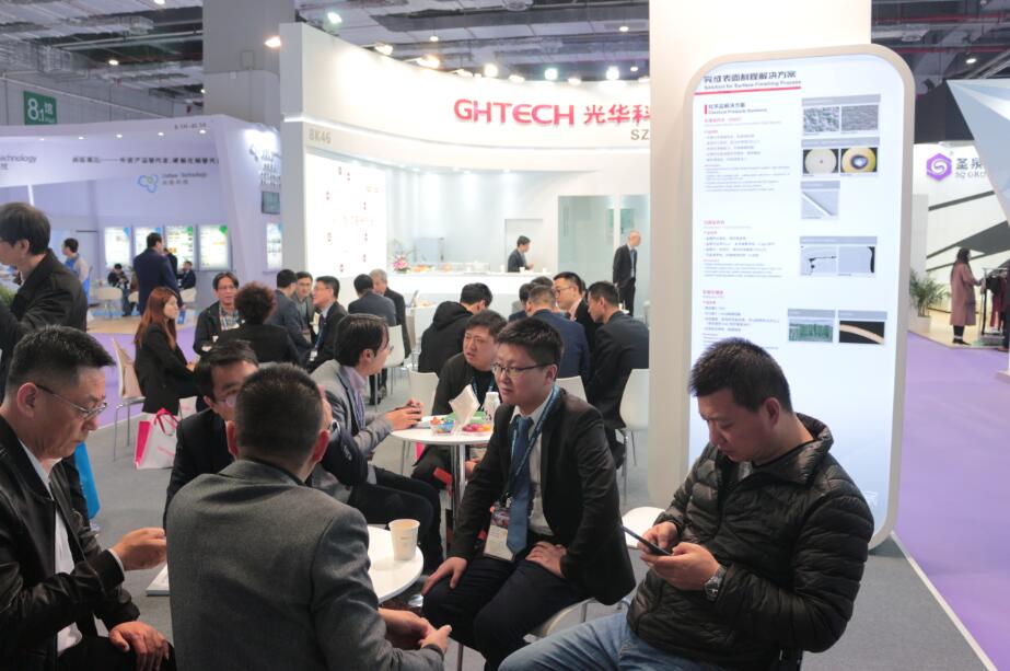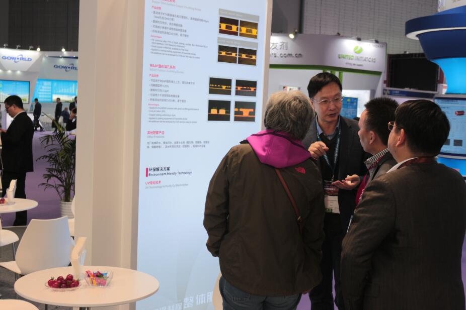 人頭攢動的展會中,光華科技在8.1號館,8K46號展臺迎來了產業鏈上下游的伙伴們。公司此次特別帶來了面向MSAP制程的專用化學品及5G相關技術,以及其他PCB濕制程化學品的新特性,如超薄面銅填孔,MSAP工藝圖形填孔;耐彎折20次以上的軟板化鎳金;適用于5G信號傳輸的沉銀、沉錫產品;以及最新的沉厚金產品。