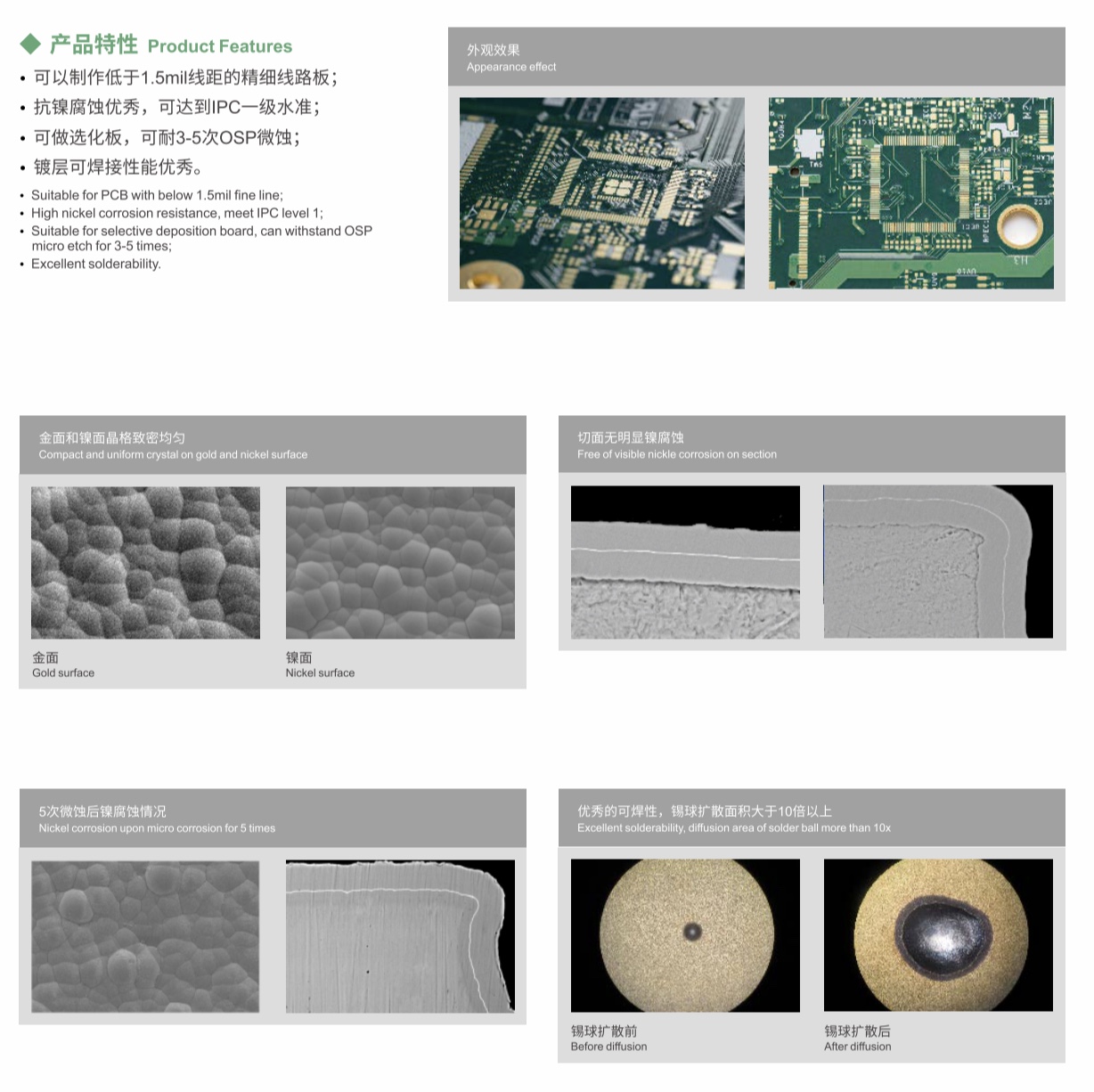 化學(xué)沉鎳金是PCB最終表面處理工藝一種,用于在金屬銅面沉上一層鎳和金,屬于中磷和中高磷系列,具有優(yōu)異的可焊性、抗腐蝕性和耐磨性,是專門為PCB最終表面設(shè)計(jì)的理想工藝