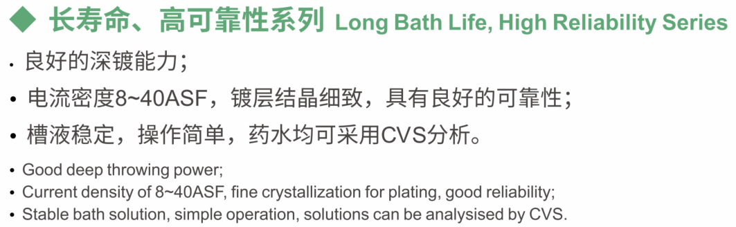 垂直連續電鍍VCP是為垂直連續電鍍設備而開發的酸性銅鍍體系,適應多種板型的電鍍需求,適用高電流密度的通孔電鍍,兼顧沉銅及有機導電膜等直接電鍍,適用通盲共鍍。